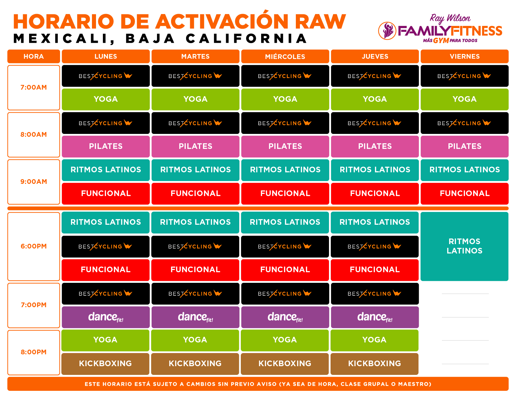 Este horario está sujeto a cambios sin previo aviso (ya sea de hora, clase grupal o maestro)